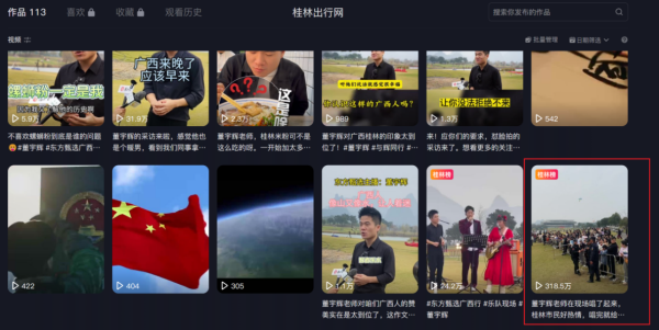 为更好迎合新媒体发展形势,为广大市民及粉丝提供最新、最快、最准确信息,近期桂林出行网聚焦微信公众号、抖音、微信视频号、小红书等新媒体平台,积极开展原创短视频创作。其中,桂林出行网受邀参加“东方甄选广西行”活动短视频,在抖音平台单视频播放量超过300万,彰显出桂林出行网在自媒体领域的市场潜力。