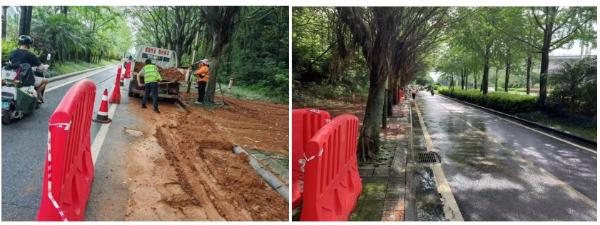 因暴雨冲刷,机场路非机动车道及人行道部分区域布满黄泥,工作人员一刻不停投入清理工作,恢复道路干净通畅。