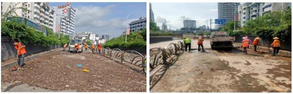良丰路吉福思门口及对面非机动车道出现污水倒灌,应急人员及时清污,清理排水口的垃圾、枯枝叶等杂物,迅速加快排水。