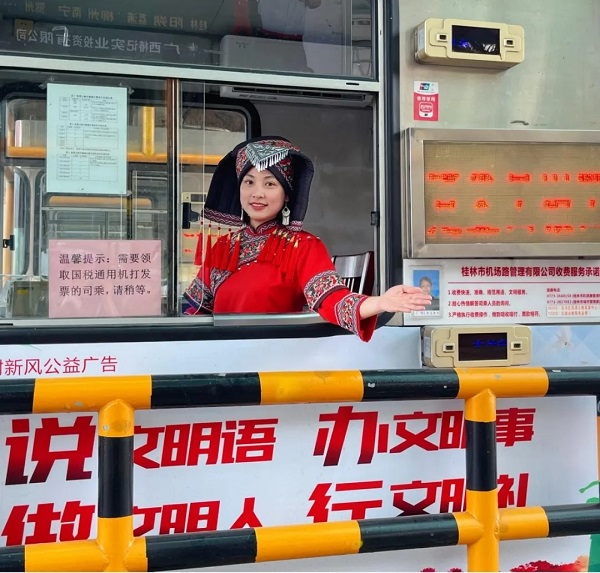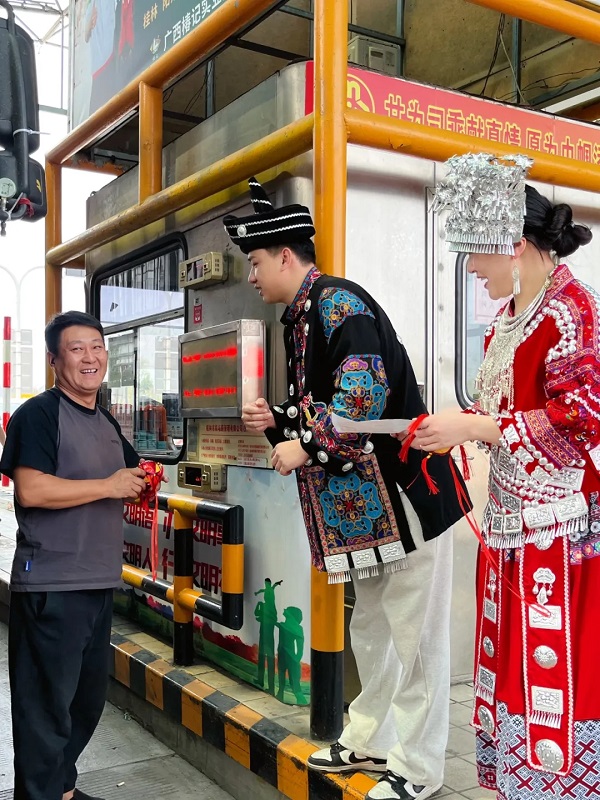 活动现场,机场路收费站工作人员身着五彩斑斓的民族服饰惊艳亮相,银饰叮当间尽显民族风情。当司乘人员驾车驶入收费站,迎面而来的不仅是热情的微笑,更是绣着壮锦纹样的文化展示。工作人员将绣球、壮锦香囊等非遗手作递到司乘手中时总会附上一句 “欢迎来到桂林”,让远道而来的游客第一时间感受到“桂林山水甲天下,道路服务更暖心” 的待客之道。