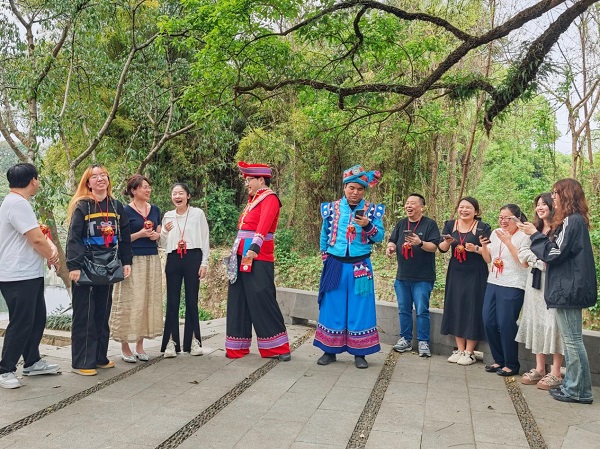 △ 少数民族员工身着传统民族服饰对唱山歌