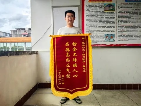 10月6日,河池乘客黄女士将装有2500元现金、身份证件及银行卡的背包遗落于6路公交车上。正当她焦急万分找到场站时,得知驾驶员莫忠迅在车辆回场后已第一时间将失物上交。这份“不耽误返程”的安心,让黄女士深受感动,专门寄来锦旗表达谢意。