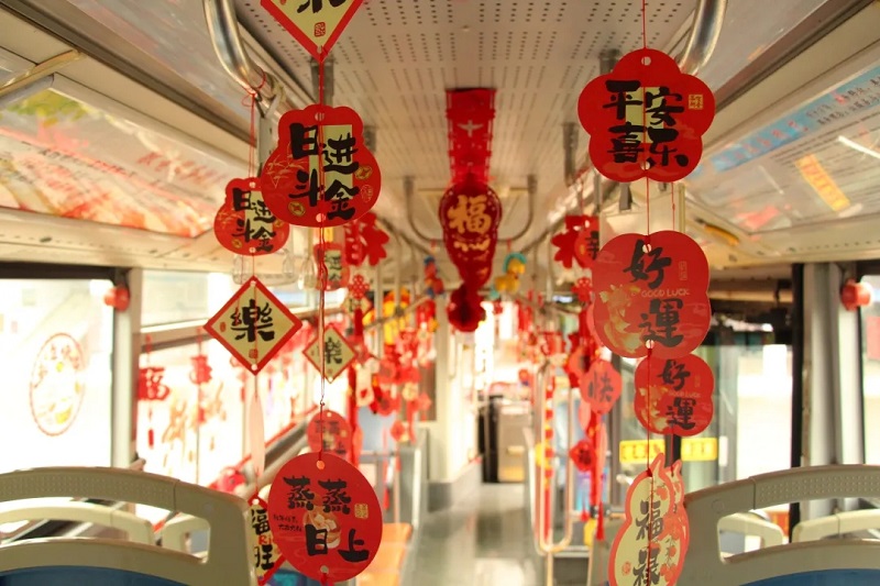 走进主题车厢,浓郁的新春氛围扑面而来,红彤彤的福字挂满车厢各个角落,可爱的小马娃娃整齐摆放于扶手旁,一抹抹中国红搭配萌趣的新春元素,让整个车厢成为移动的新春打卡点,市民乘车途中即可沉浸式感受满满的年味。