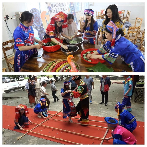 午后的场地一侧变身民族风情大观园。少数民族员工和村民们围聚在一起,兴致勃勃地制作着五色糯米饭。用浸入红蓝草、黄栀子、紫蕃藤等天然植物熬制出的汁液将原本洁白的糯米染上了绚丽色彩。大家一边操作,一边交流着制作心得,欢声笑语回荡在四周。与此同时,欢快的竹竿舞互动环节将现场氛围推向高潮。富有韵律的音乐响起,竹竿有节奏地开合碰撞,员工们热情高涨,踊跃加入其中。不同民族的员工手挽着手,伴随着欢快的节奏,迈着轻盈且整齐的步伐,在竹竿间灵活地跳跃、穿梭。他们的服饰各具特色,在舞动中相互交织,宛如一幅绚丽多彩的民族画卷。现场掌声雷动、欢笑声此起彼伏,交织成一曲和谐美好的团结之歌。